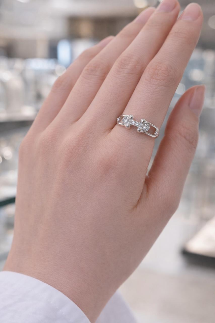 Bague au design contemporain et structuré, réalisée en métal argenté, mettant en valeur un pavé central de pierres scintillantes finement serties.