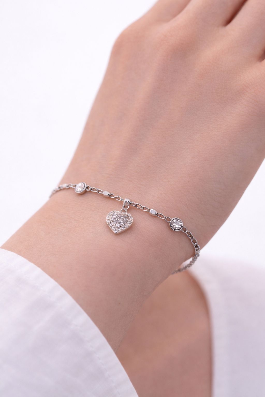 Ce bracelet en argent présente une structure asymétrique et graphique, alternant maillons allongés, perles lisses et pierres serties. L’ensemble est centré autour d’un pendentif cœur pavé de cristaux clairs, qui apporte le point focal du bijou.