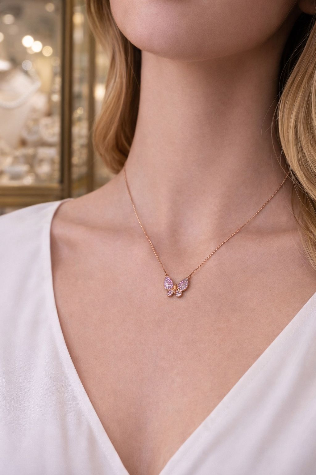 Ce collier met en avant un papillon délicatement serti, symbole de transformation, de liberté et de féminité assumée. Le pendentif, finement travaillé en métal finition or rose, est pavé de pierres roses et claires qui captent la lumière avec subtilité, sans excès.