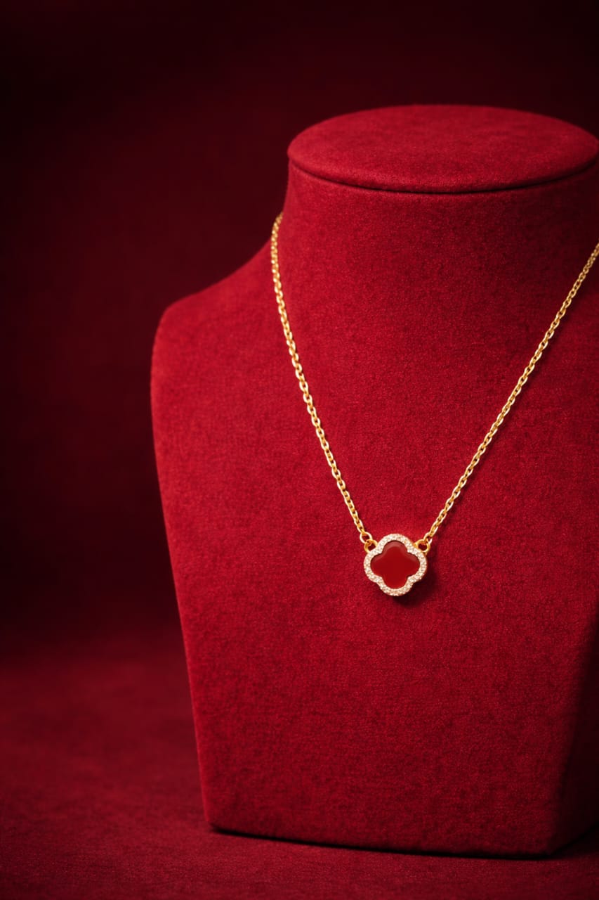 Ce collier met en valeur un pendentif en forme de trèfle, symbole intemporel de chance et d’élégance. La pièce centrale rouge profond est sublimée par un contour délicatement serti, apportant éclat et contraste.