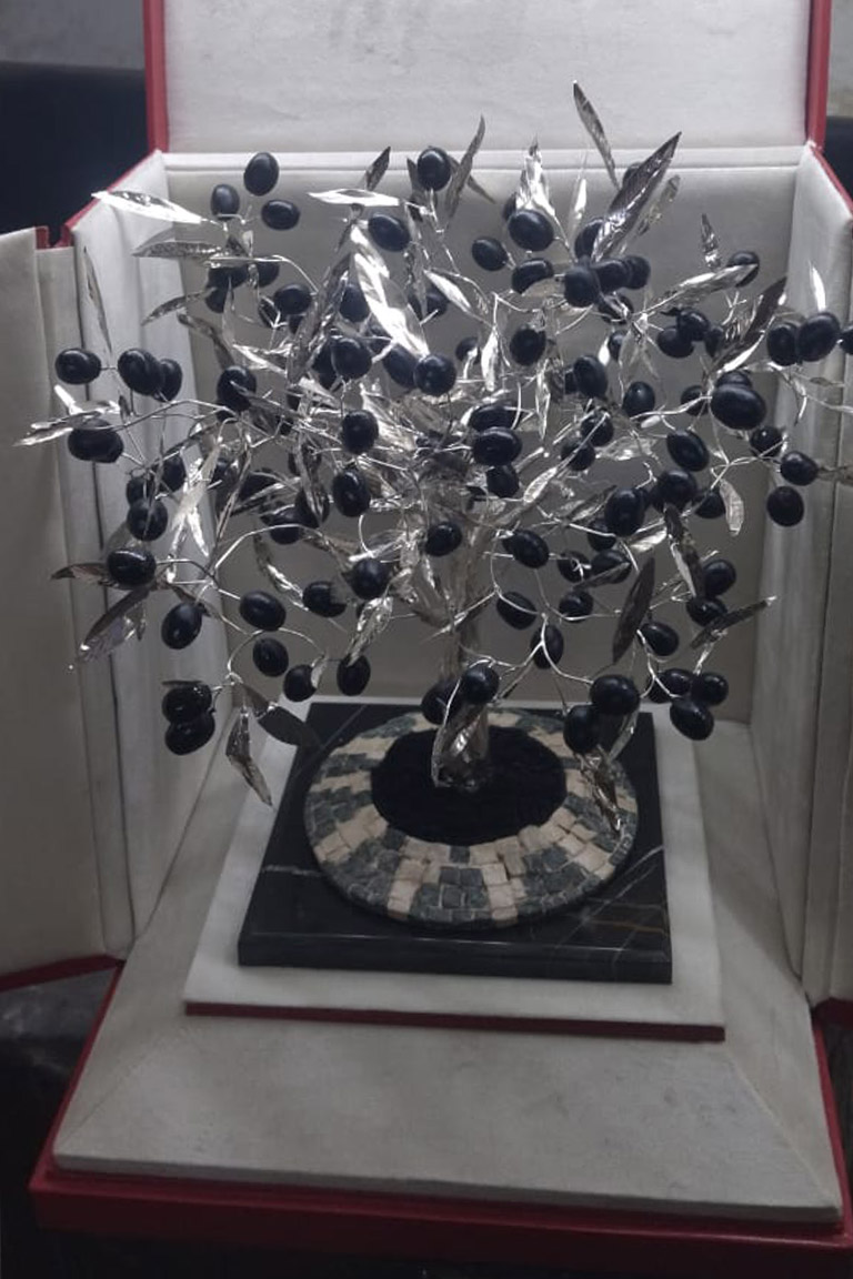 Figuier décoratif réalisé en argent massif, orné de fruits en ambre naturel noir véritable. Pièce artisanale livrée avec socle et coffret premium. Chaque pièce est unique.