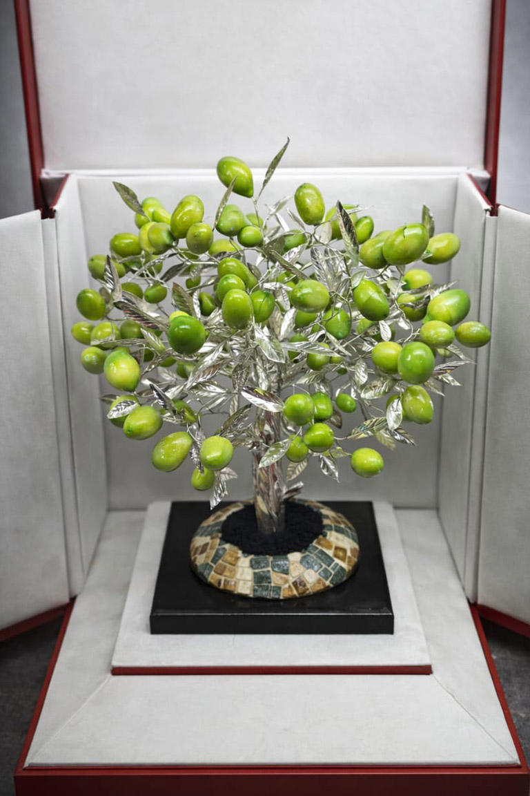 Olivier décoratif réalisé en argent massif 925, orné de fruits en ambre naturel véritable. Pièce artisanale livrée avec socle et coffret premium.